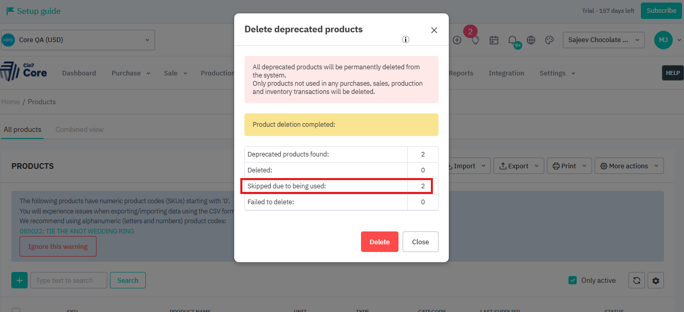 We are unable to delete the the deprecated products which are having transactions. Please refer to the error massage popping up shown in the below screenshot.