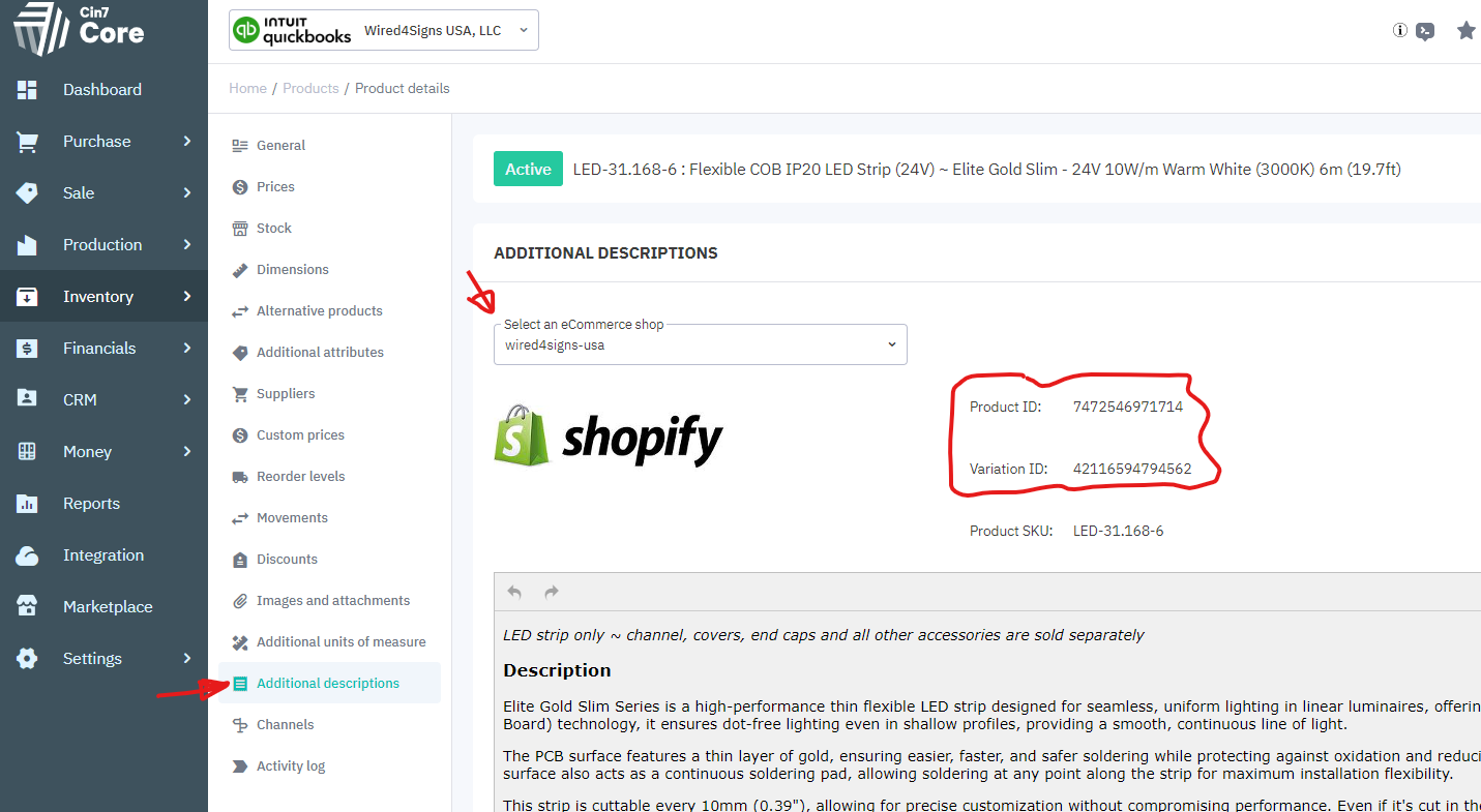 It is possible to identify the Shopify product and variant IDs in Cin7. They are visible on the "Additional descriptions" page of the product, but you need to do it manually for each SKU one by one. See below screenshot.